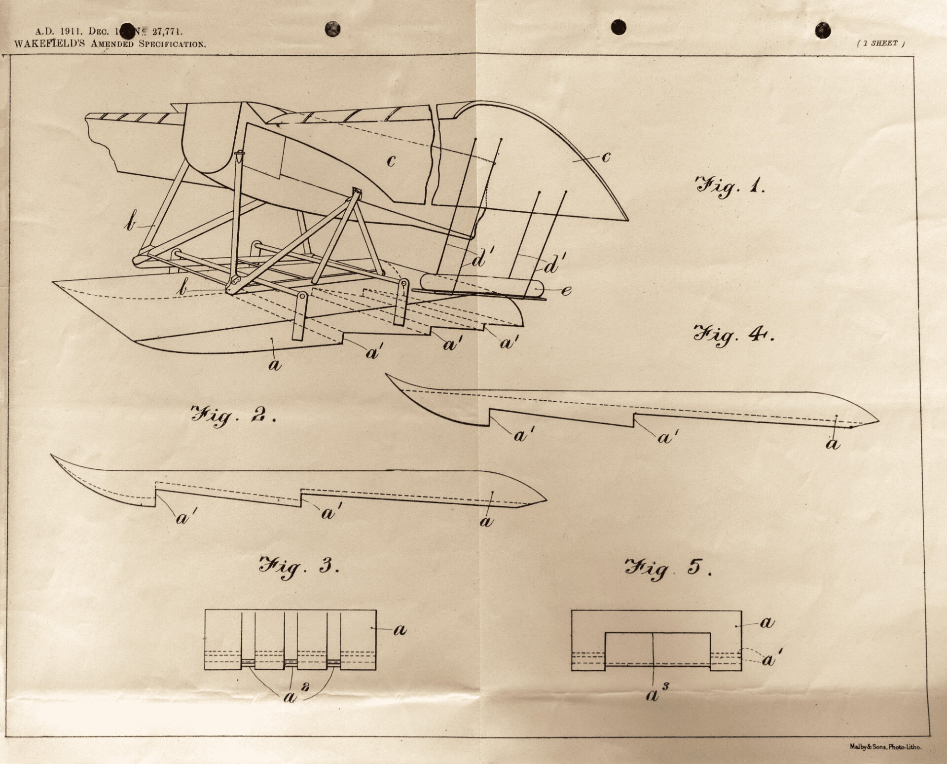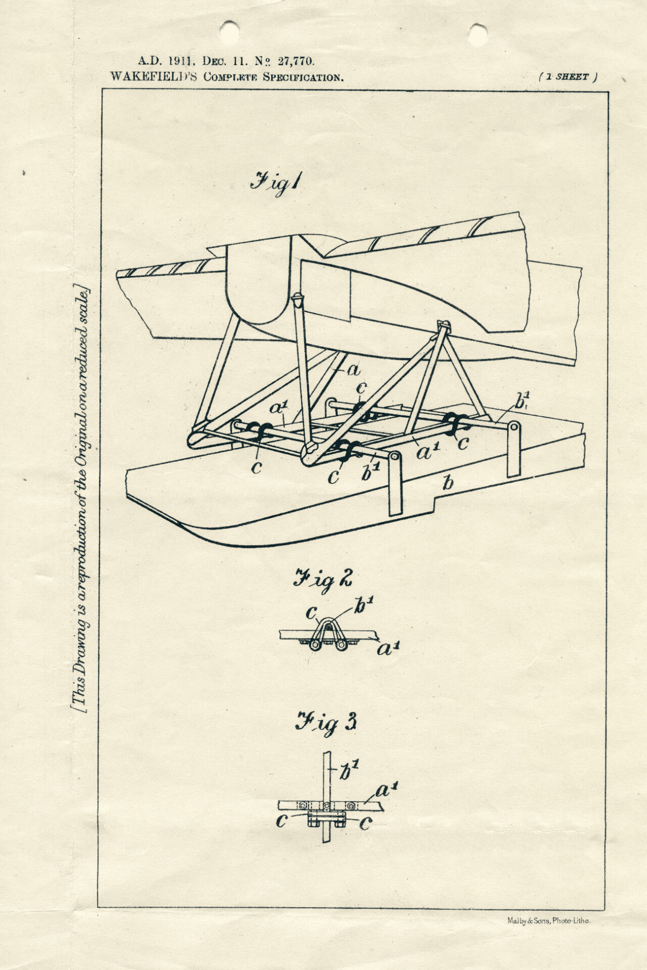 Wakefield obtained GB Patent No. 27,770 for the means of attaching a float to a hydro-aeroplane.